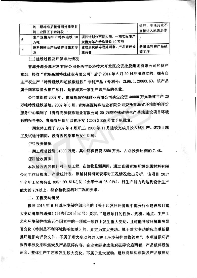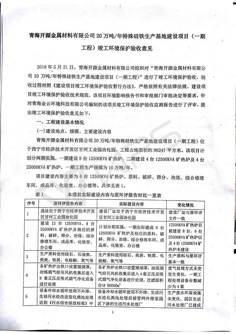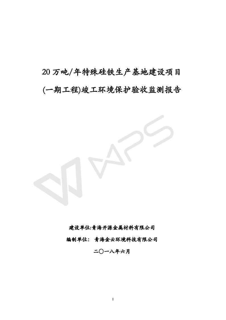 青海開源金屬材料有限公司20萬噸特殊硅鐵生產(chǎn)基地建設項目(一期工程)竣工環(huán)境保護驗收報告書會后修改20180521