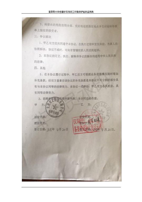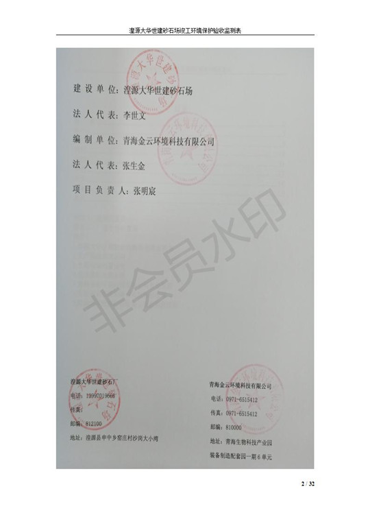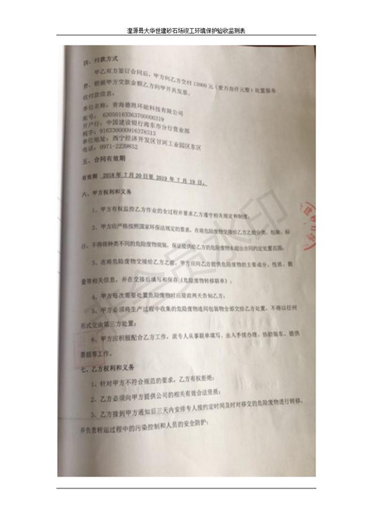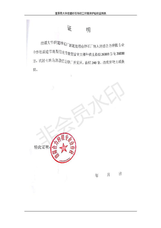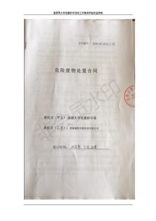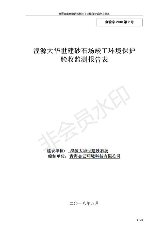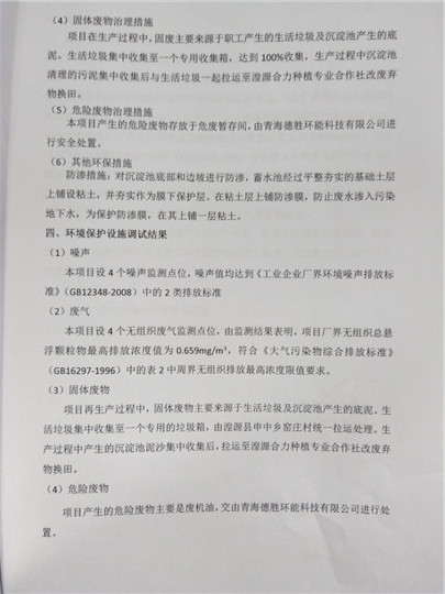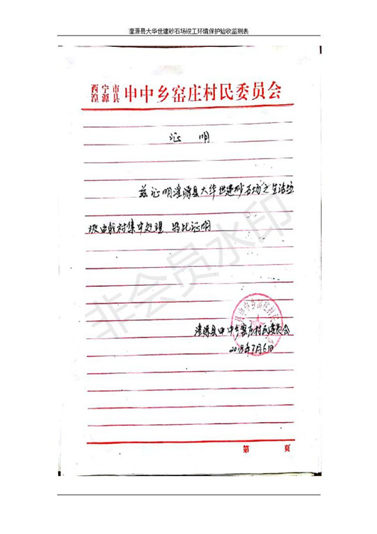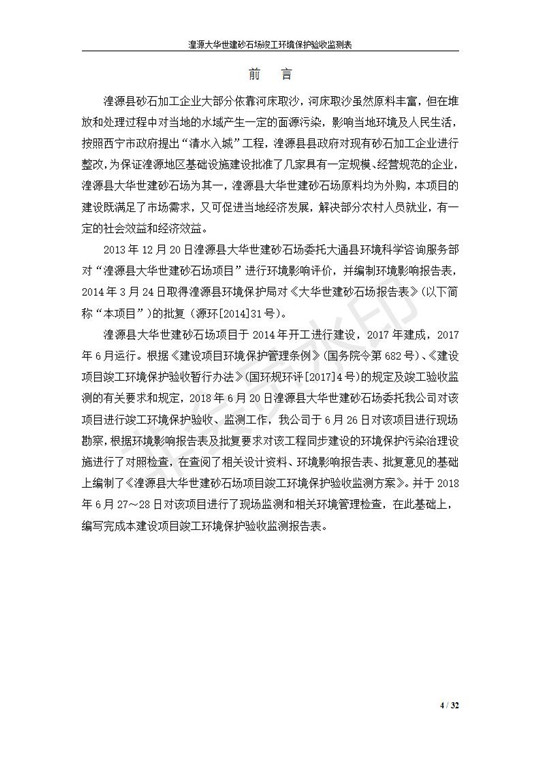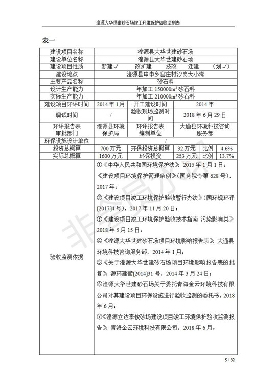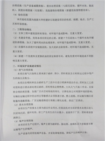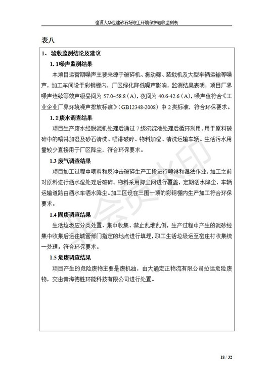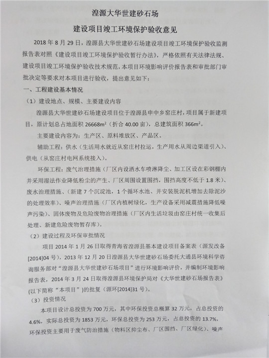 根據(jù)中華人民共和國國務院令第253號《建設項目環(huán)境保護管理條例》(中華人民共和國國務院令第682號《國務院關于修改〈建設項目環(huán)境保護管理條例〉的決定》和《建設項目竣工環(huán)境保護驗收暫行辦法》,嚴格依照有關法律法規(guī),建設項目環(huán)境保護設施驗收技術規(guī)范,本項目環(huán)評報告表和環(huán)保審批部門審批意見以及企業(yè)自行驗收相關要求等對本項目進行驗收,本項目符合環(huán)保驗收條件,可以通過環(huán)保驗收。 湟源大華世建砂石場建設項目竣工環(huán)境保護驗收意見.