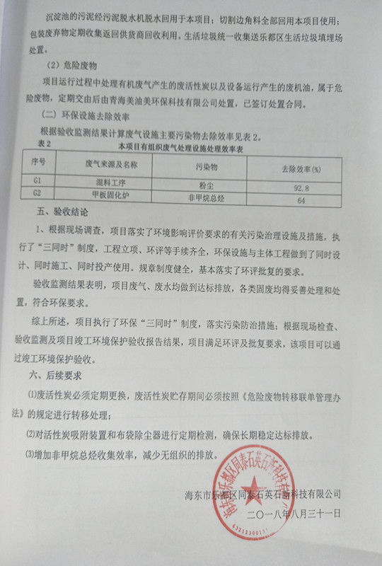 根據(jù)中華人民共和國國務(wù)院令第253號《建設(shè)項目環(huán)境保護管理條例》(中華人民共和國國務(wù)院令第682號《國務(wù)院關(guān)于修改〈建設(shè)項目環(huán)境保護管理條例〉的決定》和《建設(shè)項目竣工環(huán)境保護驗收暫行辦法》,嚴格依照有關(guān)法律法規(guī),建設(shè)項目環(huán)境保護設(shè)施驗收技術(shù)規(guī)范,本項目環(huán)評報告表和環(huán)保審批部門審批意見以及企業(yè)自行驗收相關(guān)要求等對本項目進行驗收,本項目符合環(huán)保驗收條件,可以通過環(huán)保驗收。 海東市樂都區(qū)同泰科技有限公司竣工環(huán)境保護驗收監(jiān)測報告公示