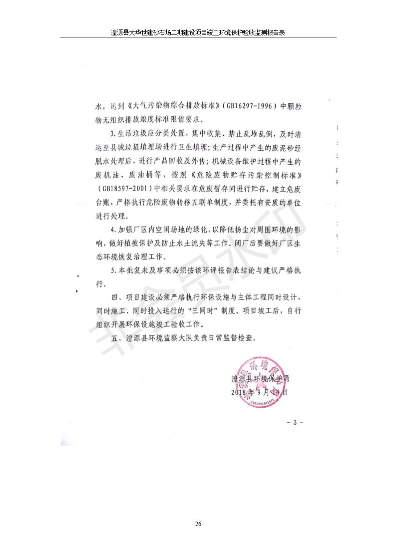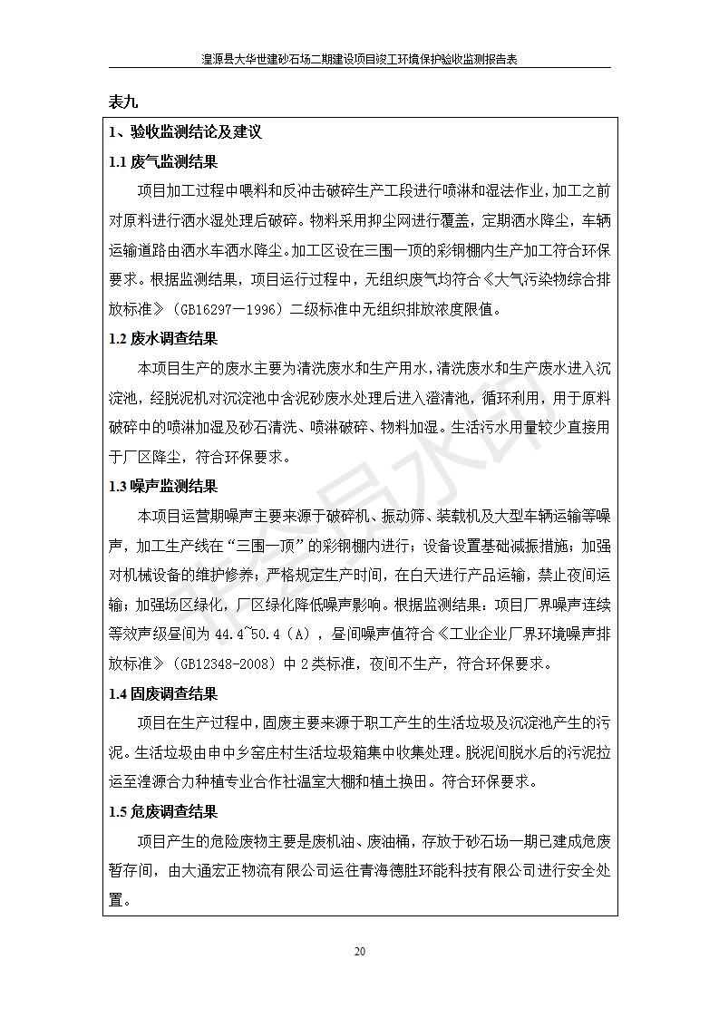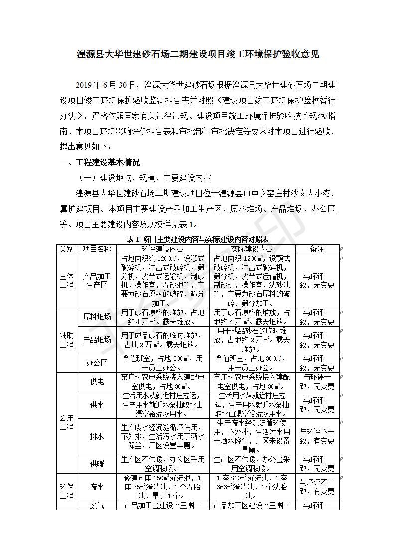 根據(jù)中華人民共和國國務(wù)院令第682號(hào)《國務(wù)院關(guān)于修改〈建設(shè)項(xiàng)目環(huán)境保護(hù)管理?xiàng)l例〉的決定》和《建設(shè)項(xiàng)目竣工環(huán)境保護(hù)驗(yàn)收暫行辦法》(國務(wù)院令682號(hào)),湟源大華世建砂石場(chǎng)湟源縣大華世建砂石場(chǎng)二期建設(shè)項(xiàng)目(包括竣工環(huán)境保護(hù)驗(yàn)收監(jiān)測(cè)報(bào)告表和驗(yàn)收意見)公示如下。 一、項(xiàng)目名稱:湟源縣大華世建砂石場(chǎng)二期建設(shè)項(xiàng)目 二、地點(diǎn):湟源縣申中鄉(xiāng)窯莊村沙崗大小灣 三、建設(shè)單位:湟源大華世建砂石場(chǎng) 四、建設(shè)內(nèi)容:項(xiàng)目主要建設(shè)砂石料產(chǎn)品加工生產(chǎn)區(qū)、原料堆場(chǎng)、產(chǎn)品堆場(chǎng)、辦公區(qū)等。五、聯(lián)系人:張工 六、聯(lián)系電 話:0971-6515411 七、公示時(shí)間:二〇一九年七月二十五日至二〇一九年八月二十一日公示期間,對(duì)上述公示內(nèi)容如有異議,請(qǐng)以書面形式反饋,個(gè)人須署真實(shí)姓名,單位須加蓋公章。