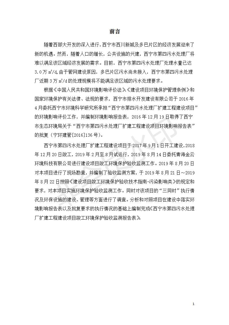 根據(jù)中華人民共和國(guó)國(guó)務(wù)院令第682號(hào)《國(guó)務(wù)院關(guān)于修改〈建設(shè)項(xiàng)目環(huán)境保護(hù)管理?xiàng)l例〉的決定》和《建設(shè)項(xiàng)目竣工環(huán)境保護(hù)驗(yàn)收暫行辦法》(國(guó)務(wù)院令682號(hào)),西寧市第四污水處理廠擴(kuò)建工程建設(shè)項(xiàng)目(包括竣工環(huán)境保護(hù)驗(yàn)收監(jiān)測(cè)報(bào)告表和驗(yàn)收意見(jiàn))公示如下。 一、項(xiàng)目名稱:西寧市第四污水處理廠擴(kuò)建工程建設(shè)項(xiàng)目 二、地點(diǎn):五四西路南側(cè),原西寧市第四污水處理廠西側(cè)用地 三、建設(shè)單位:西寧市排水開(kāi)發(fā)建設(shè)有限公司 四、建設(shè)內(nèi)容:第四污水處理廠擴(kuò)建工程五、聯(lián)系人:張工 六、聯(lián)系電 話:0971-6515411 七、公示時(shí)間:二〇一九年九月十七日至二〇一九年十月十八日公示期間,對(duì)上述公示內(nèi)容如有異議,請(qǐng)以書(shū)面形式反饋,個(gè)人須署真實(shí)姓名,單位須加蓋公章。
