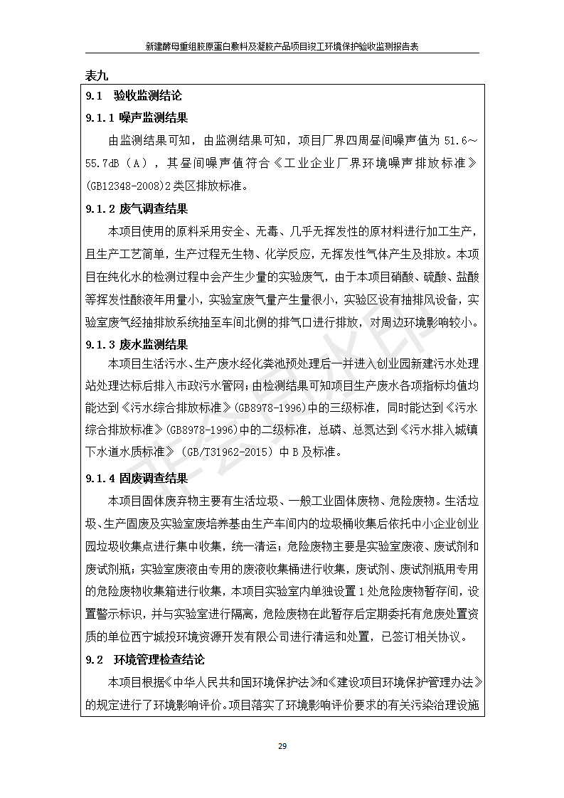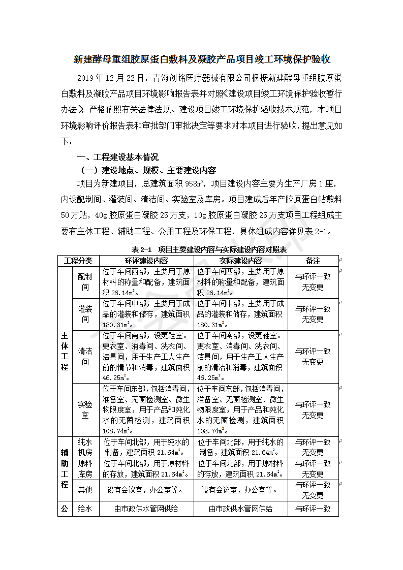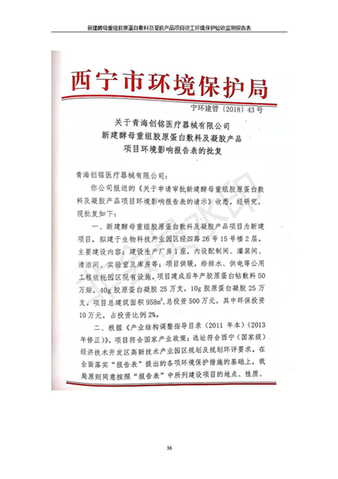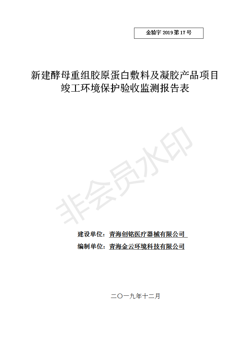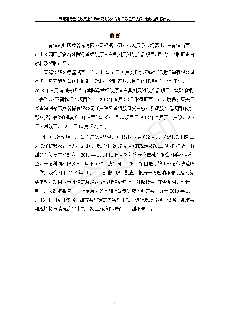 根據(jù)中華人民共和國國務(wù)院令第682號《國務(wù)院關(guān)于修改〈建設(shè)項目環(huán)境保護管理條例〉的決定》和《建設(shè)項目竣工環(huán)境保護驗收暫行辦法》(國務(wù)院令682號),新建酵母重組膠原蛋白敷料及凝膠產(chǎn)品項目(包括竣工環(huán)境保護驗收監(jiān)測報告表和驗收意見)公示如下。 一、項目名稱:新建酵母重組膠原蛋白敷料及凝膠產(chǎn)品項目 二、地點:西寧市生物園區(qū)經(jīng)四路26號15號樓2層 五、聯(lián)系人:董繼風(fēng) 六、聯(lián)系電話:18606125050 七、公示時間:二〇二〇年一月十三日至二〇二〇年二月十二日 公示期間,對上述公示內(nèi)容如有異議,請以書面形式反饋,個人須署真實姓名,單位須加蓋公章。