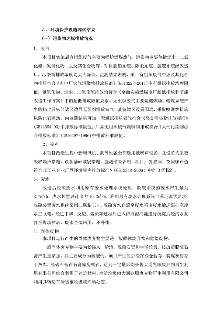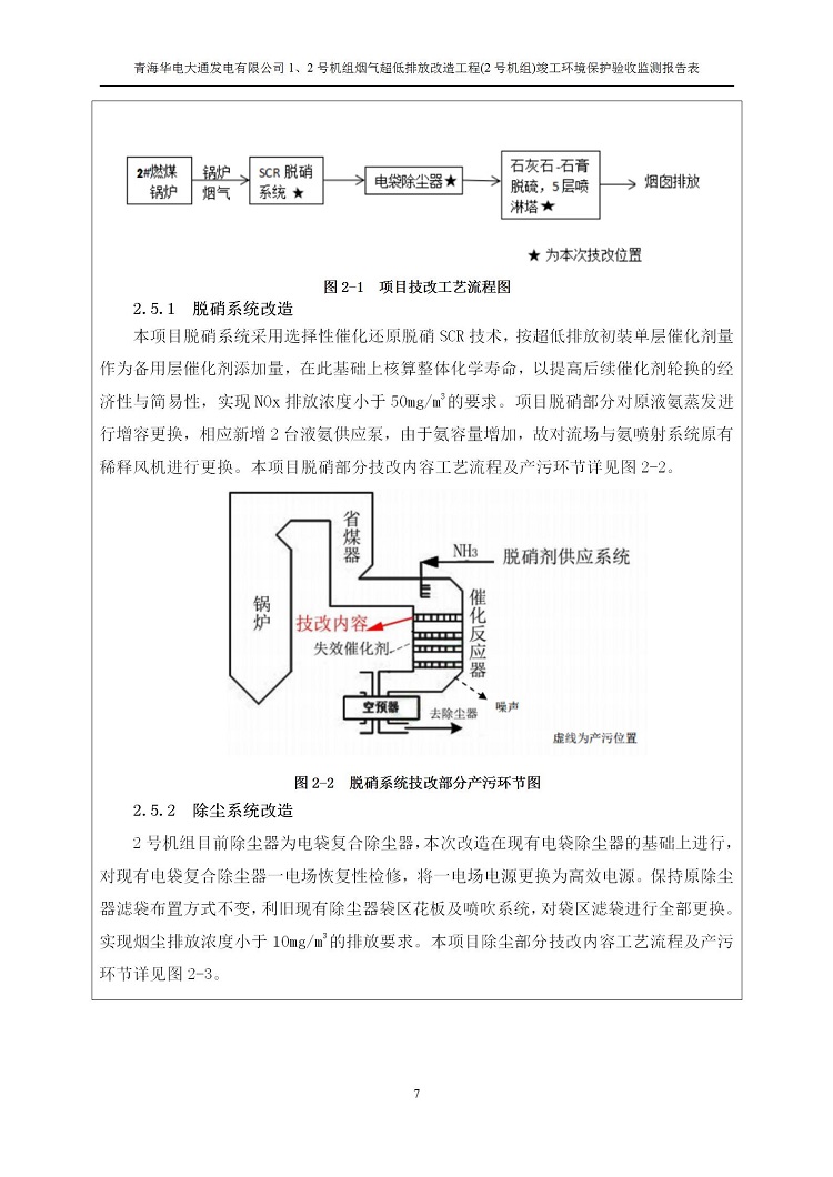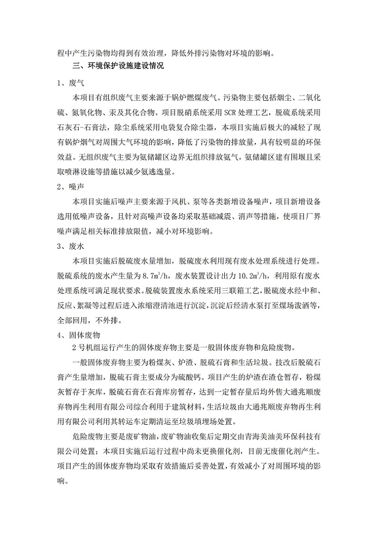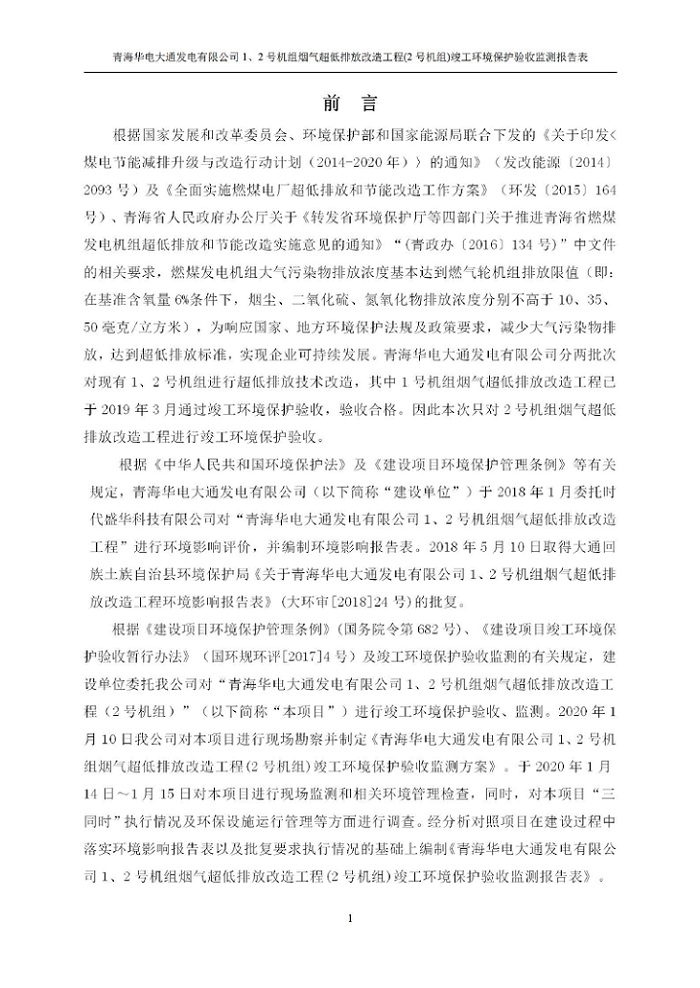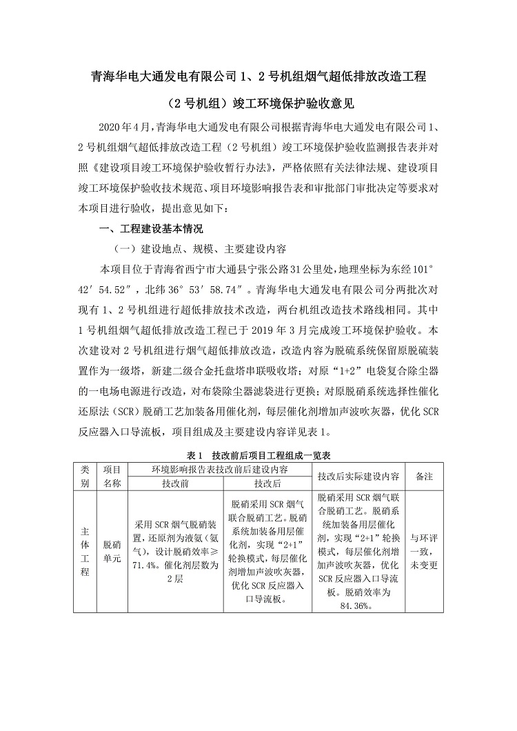 根據(jù)中華人民共和國國務(wù)院令第682號《國務(wù)院關(guān)于修改〈建設(shè)項目環(huán)境保護管理條例〉的決定》和《建設(shè)項目竣工環(huán)境保護驗收暫行辦法》(國務(wù)院令682號),青海華電大通發(fā)電有限公司1、2號機組煙氣超低排放改造工程(2號機組) (包括竣工環(huán)境保護驗收監(jiān)測報告表和驗收意見)公示如下。 一、項目名稱:青海華電大通發(fā)電有限公司1、2號機組煙氣超低排放改造工程(2號機組) 竣工環(huán)境保護驗收監(jiān)測報告表 二、地點:青海省西寧市大通縣寧張公路31公里處 三、建設(shè)單位:青海華電大通發(fā)電有限公司 四、建設(shè)內(nèi)容:2號機組煙氣超低排放改造,2號機組改造內(nèi)容為脫硫系統(tǒng)保留原脫硫裝置作為一級塔,新建二級合金托盤塔串聯(lián)吸收塔;對原“1+2”電袋復(fù)合除塵器的一電場電源進行改造,對布袋除塵器濾袋進行更換;對原脫硝系統(tǒng)選擇性催化還原法(SCR)脫硝工藝加裝備用催化劑,每層催化劑增加聲波吹灰器,優(yōu)化SCR反應(yīng)器入口導(dǎo)流板。 五、聯(lián)系人:馬世敏 六、聯(lián)系電 話:0971-6515411 七、公示時間:二〇二〇年四月二十九日至二〇二〇年五月二十八日 公示期間,對上述公示內(nèi)容如有異議,請以書面形式反饋,個人須署真實姓名,單位須加蓋公章。